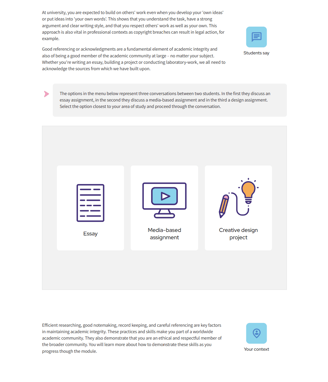 This project involved reviewing and substantially updating an existing Academic Integrity course as part of Epigeum’s Becoming a Researcher programme. A key challenge was ensuring that the course worked effectively across four distinct higher education contexts, requiring careful consideration of language, examples, expectations, and learner experience.